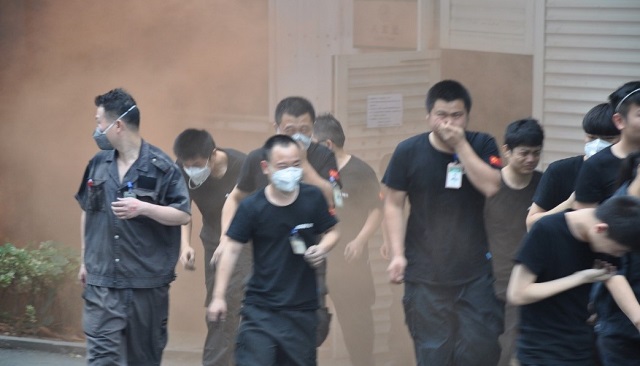 消防警報拉響員工有序從通道跑出