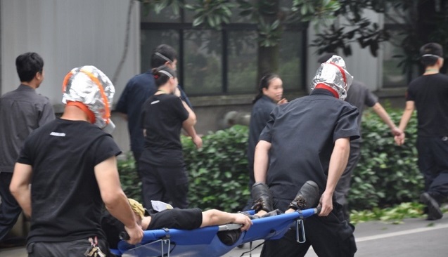 成立搜救小組對廠區內未及時逃離火災的受傷受困人員進行搜救,經過仔細尋找搜索,成功搜救出一名受困者,用擔架將其抬出,抬至安全集散地先進行初步搶救。目的是為了培養員工的搜救技能,以及安全意識。