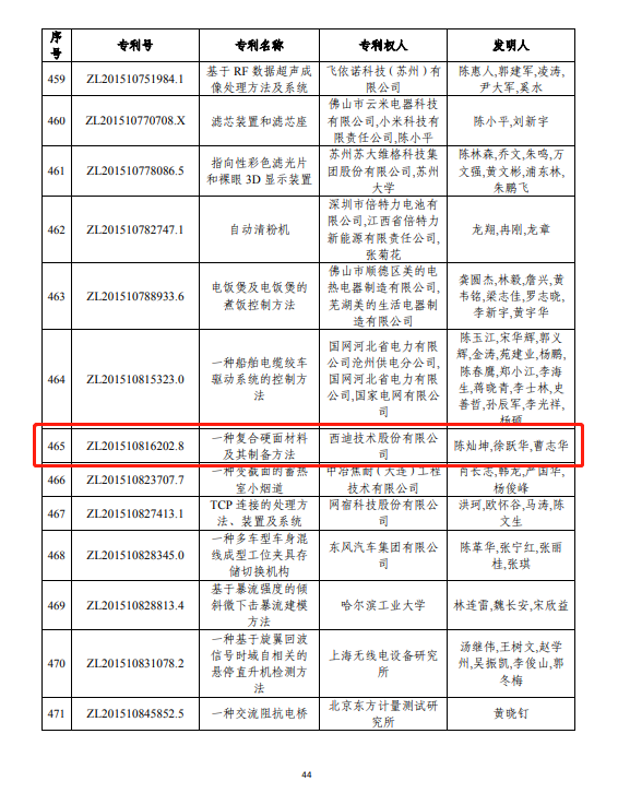 近日,國家知識產權局發(fā)布了關于第二十二屆中國專利獎評審結果公示。西迪技術股份有限公司《一種復合硬面材料及其制備方法》發(fā)明專利榮獲“第二十二屆中國專利優(yōu)秀獎”。
