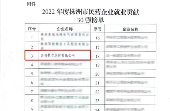 2023年3月10日,株洲市人力資源和社會保障工作會議在市人力資源和社會保障局召開。會議為“2022年度主軸市民營企業(yè)就業(yè)貢獻(xiàn)30強(qiáng)”進(jìn)行了授牌頒獎,本次表彰共授予株洲市30家企業(yè)“就業(yè)貢獻(xiàn)獎”稱號,西迪技術(shù)股份有限公司榮獲“2022年度株洲市民營企業(yè)就業(yè)貢獻(xiàn)獎”稱號。